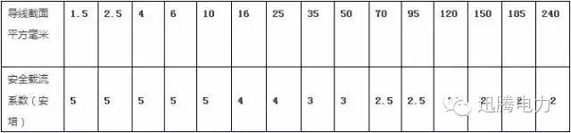 说明:十下五是指导线截面在10平方毫米以下,每平方毫米的安全电流为5安培;百上二是指导线截面在100平方毫米以上,每一平方毫米安全电流为2安培;二五三五四三界是指导线截面在16平方毫米、25平方毫米,每1平方毫米安全电流为4安培,导线截面在35平方毫米和50平方毫米,每1平方毫米安全电流为3安培;七零、九五两倍半是指每1平方毫米的安全电流为2.5安培;裸线加一半,铜线升级算是指截面的裸导线,可按绝缘导线乘以1.5倍计算安全电流,同截面的铜导线按铝导线大一线号等级计算安全电流;穿管温度八、九折是指导线穿管乘系数0.8,高温场所实用乘以系数0.9。