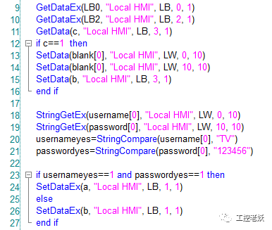 当用户名和密码都和输入的一样,就把HMI内部存储器的LB1设置成1。