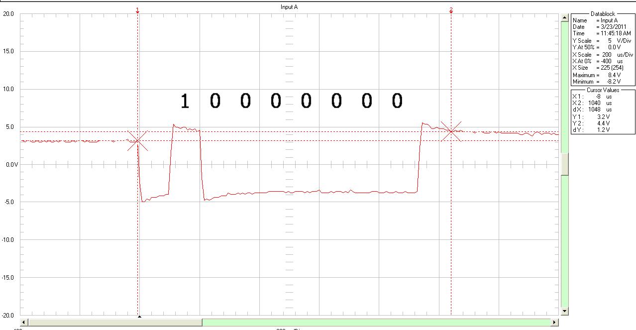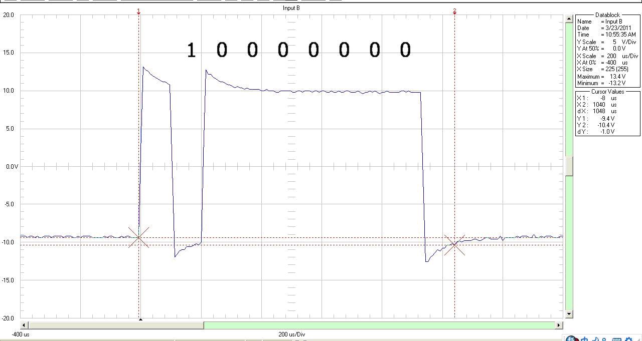 一般而言,232接口的高电平“1”是用-5~-15V的电压表示,低电平“0”是用+5~+15V的电压表示,结合图1,高电平“1”的电压为-10V左右,低电平“0”的电压为+10V左右。