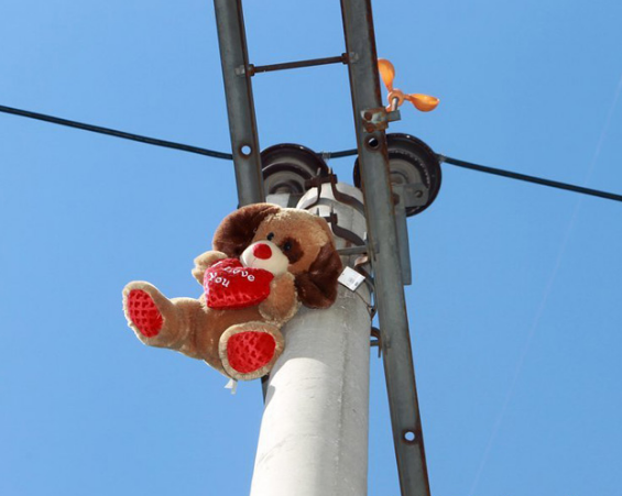 (某年某日,出门抬头一看,发现电杆上有一只玩具熊,据说也是驱鸟的,顿时吐血三升……)