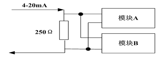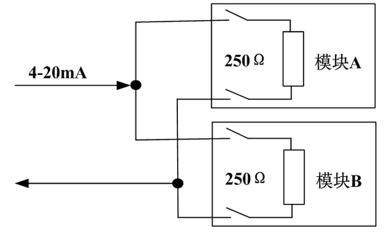 控制I/O模块要求冗余配置,常用的是AI冗余有两种原理,以Honeywell C300硬件为代表采用并联冗余机制,原理是将电流信号通过同一个250欧姆电阻,转换为电压信号,再并联两个测电压模块同时测量,同时送控制器,由控制器挑选品质好的模块运算。并联式冗余示意图如图4-1-3。