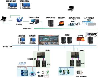 系统主要有现场控制站(I/O站)、数据通讯系统、人机接口单元(操作员站OPS、工程师站ENS)、机柜、电源等组成。系统具备开放的体系结构,可以提供多层开放数据接口。
