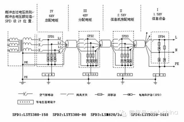 1、交流配电系统耐冲击电压类别以及用浪涌保护器分级保护示意图