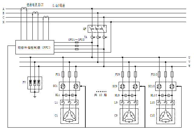 无功补偿装置其安装容量为400kvar,采用三相干式铁芯电抗器,额定电抗率为14%;采用快速可控硅开关进行投切,重复投切时间间隔20ms,电容器无需放电,实时跟踪负荷的快速变化。共分10路,每路40kvar,选用0.525kV,50Hz,40kvar三相并联电容器,编码投切方式,控制器相应时间20ms。无功补偿一次原理图见图1。