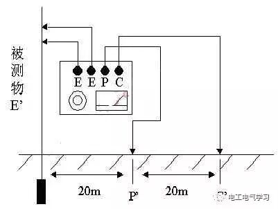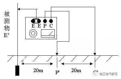 5.使用与操作 1、测量接地电阻值时接线方式的规定仪表上的E端钮接5m导线,P端钮接20m线,C端钮接40m线,导线的另一端分别接被测物接地极Eˊ,电位探棒Pˊ和电流探棒Cˊ,且Eˊ、Pˊ、Cˊ应保持直线,其间距为20m。