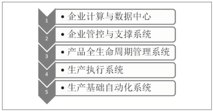 智能制造系统是供应链中的各个企业通过由网络和云应用为基础构建的制造网络实现相互链接所构成的。企业智能制造系统的构成是由企业计算与数据中心、企业管控与支撑系统、为实现产品全生命周期管理集成的各类工具共同构成,智能制造系统具有可持续优化的特征。智能制造系统可分为五层,第一层是生产基础自动化系统,第二层是生产执行系统,第三层是产品全生命周期管理系统,第四层是企业管控与支撑系统,第五层是企业计算与数据中心(私有云)。
