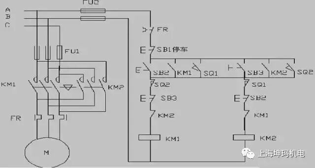 在该控制线路中,KM1 为正转交流接触器,KM2 为反转交流接触器,SB1 为停止按钮、SB2 为正转控制按钮,SB3 为反转控制按钮。KM1、KM2 常闭触点相互闭锁,当按下SB2 正转按钮时,KM1 得电,电机正转;KM1 的常闭触点断开反转控制回路,此时当按下反转按钮,电机运行方式不变;若要电机反转,必须按下SB1停止按钮,正转交流接触器失电,电机停止,然后再按下反转按钮,电机反转。若要电机正转,也必须先停下来,再来改变运行方式。这样的控制线路的好处在于避免误操作等引起的电源短路故障。