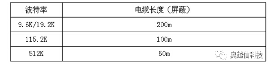 实现正常通讯,通讯电缆的最大长度与波特率的设置有关系,如下表注:通信电缆需带屏蔽层的双绞铜芯线(如:西门子的DP紫色电缆)