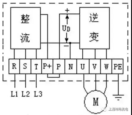 各种变频器主电路的对外连接端子大致相同,如图2所示。其中,R、S、T是变频器的电源端子,接至交流三相电源;U、V、W为变频器的输出端子,接至电动机;P+是整流桥输出的+端,出厂时P+端与P端之间用一块截面积足够大的铜片短接,当需要接入直流电抗器DL时,拆去铜片,将DL接在P+和P之间;P、N是滤波后直流电路的+、-端子,可以连接制动单元和制动电阻;PE是接地端子。