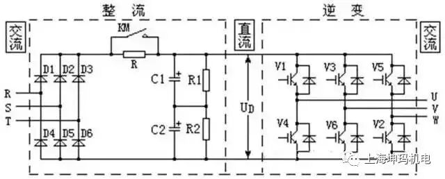 图1中,滤波电容器C1和C2两端各并联了一个电阻,是为了使两只电容器上的电压基本相等,防止电容器在工作中损坏(目前,由于技术的进步,低压(380V)变频器的电解电容大多数可以不需要串联使用了)。在整流桥和滤波电容器之间接有一个电阻R和一对接触器触点KM,其缘由是:变频器刚接通电源时,滤波电容器上的电压为0V,而电源电压为380V时的整流电压峰值是537V,这样在接通电源的瞬间将有很大的充电冲击电流,有可能损坏整流二极管;另外,端电压为0的滤波电容器会使整流电压瞬间降低至0V,形成对电源网络的干扰。为了解决上述问题,在整流桥和滤波电容器之间接入一个限流电阻R,可将滤波电容器的充电电流限制在一个允许范围内。但是,如果限流电阻R始终接在电路内,其电压降将影响变频器的输出电压,也会降低变频器的电能转换效率,因此,滤波电容器充电完毕后,由接触器KM将限流电阻R短接,使之退出运行。