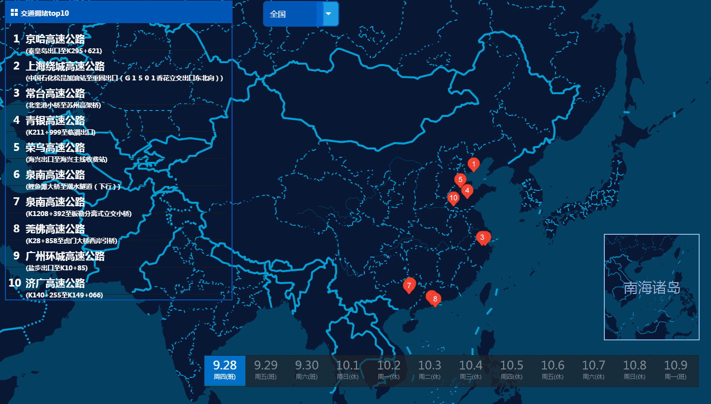 十一期间,全国最拥堵路段主要集中在京津冀、长三角、珠三角和成渝地区,在预测报告中,10月1日的拥堵全国前十是: