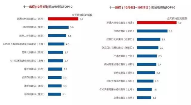 10月1日为高速出程高峰,苏州苏通大桥南收费站拥堵程度最高,其次为重庆沙坪坝收费站;