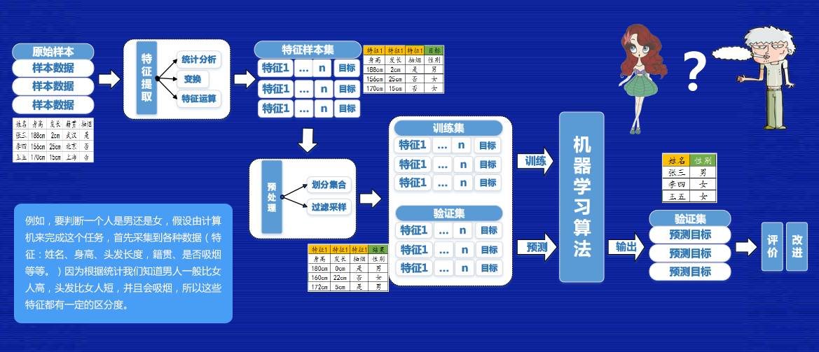所谓机器学习过程,是指观察有n个样本数据组成的集合,并根据这些数据来预测未知数据的性质,那么在给定数据集(所谓大数据)和具体问题的前提下,一般解决问题的步骤可以概括如下: