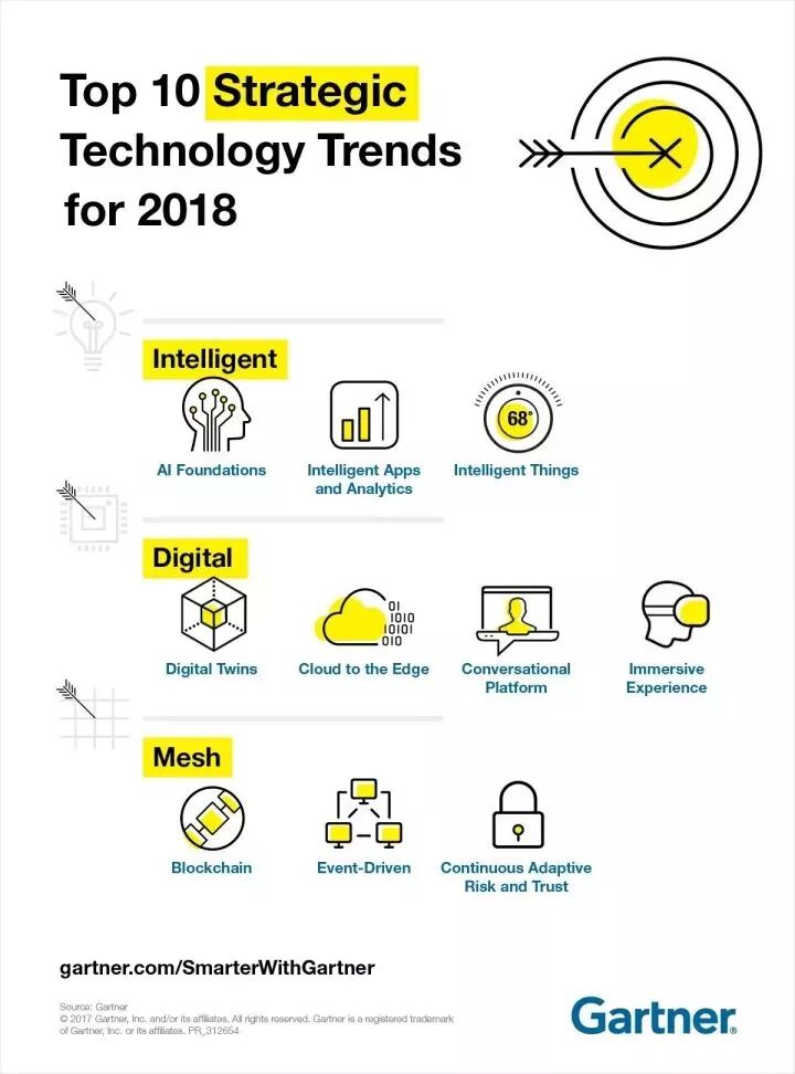 Gartner副总裁兼院士级分析师David Cearley表示:“Gartner的2018年十大战略科技发展趋势(top 10 strategic technology trends for 2018)与智能数字格网(Intelligent Digital Mesh)息息相关。智能数字格网是未来数字化业务与生态系统的基础。在制定创新战略时,IT领导者必须考虑这些技术趋势,否则将面临节节败退的风险。”