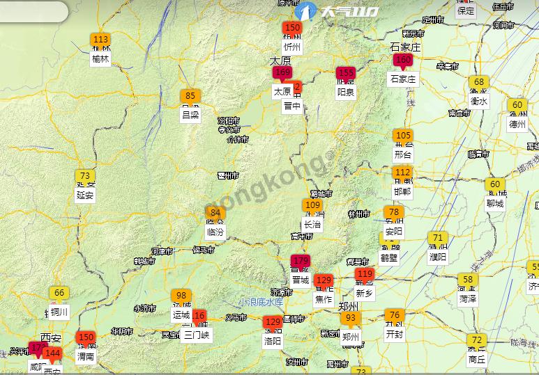 6日,雾霾如约而至,北方大部分地区纷纷沦陷,其中以咸阳为首,PM2.5指数高达170μg/m3,其次是晋城179μg/m3,太原169μg/m3,石家庄160μg/m3,,均已达到重度污染。