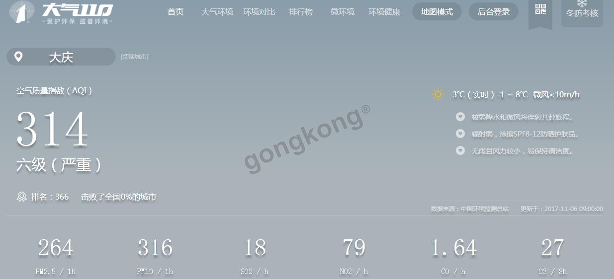 OMG,这还是我们所熟悉的那个黑龙江吗?颜色怎会如此“艳丽”?其中大庆PM2.5的指数竟然高达264μg/m3,排名第二的伊春为262μg/m3。此外,据“大气110”平台显示,大庆的温度在-1~8℃之间。心疼黑龙江的小伙伴们,因为它们有的不仅仅是雾霾,还有寒冷。