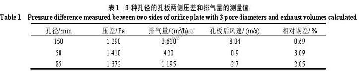 表1列出了测试结果。从表1可见,孔径为85mm时,排气量为1195m3/h,与设计要求排气量1200m3/h非常接近,相对误差在允许范围内,说明孔板流量计开孔直径85mm较合适。