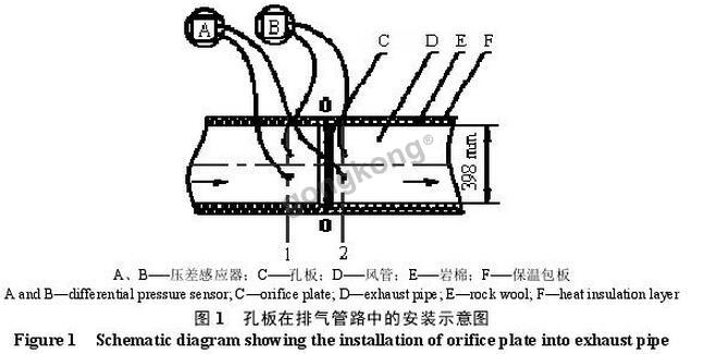 流体流过孔板流量计时,流股收缩,过孔板流量计后,流股继续收缩,然后扩展,其最小截面处称作“缩脉”。孔板流量计之前某流线平行的截面为1截面,因“缩脉”处流线也平行,故取“缩脉”处为2截面,设截面1、2处的修正压强分别为pm,1和pm,2(单位均为Pa),流经孔板流量计处的流速为0u(单位为m/s)。当排气的温度恒定,气体密度恒定不变时,孔板流量计流量计的阻力hf≈0.4u02[2]。由于孔板流量计两侧的1、2点位于排气管道的平直段,距离很近,因此实际应用时hf≈pm,1-pm,1。又因排气量Q=u0·A(其中A为开孔面积,单位为m2),故通过测量固定孔径的孔板流量计两侧压差便可计算排气量。