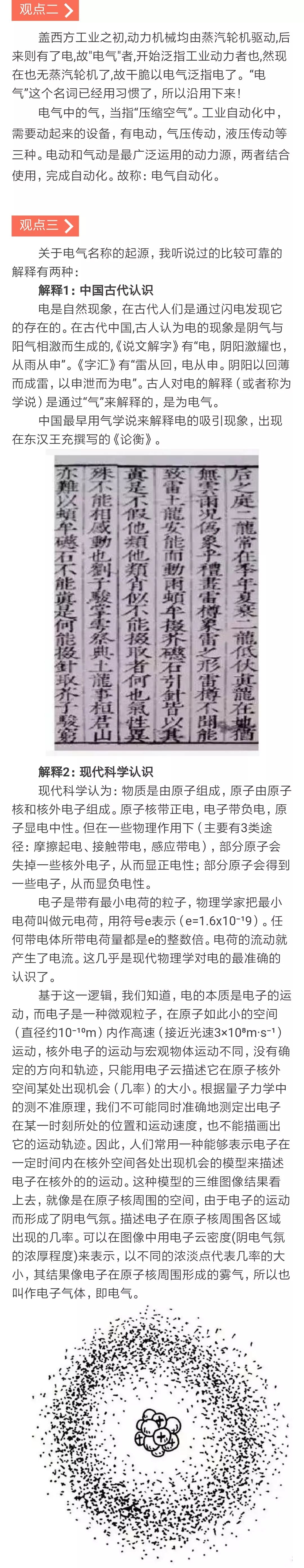 我认为“电气控制”可能源于英语的“Electronic Pneumatic Control". 自动控制最早是从 "Pneumatic" 开始的,后来才慢慢有了Electronic 的;再后面Electronics的越来越好,应用越来越广,而Pneumatic的应用就越来越少。Pneumatic就是压缩或压力空气。我安装,调校,维修过很多Pneumatic 控制器和执行器。