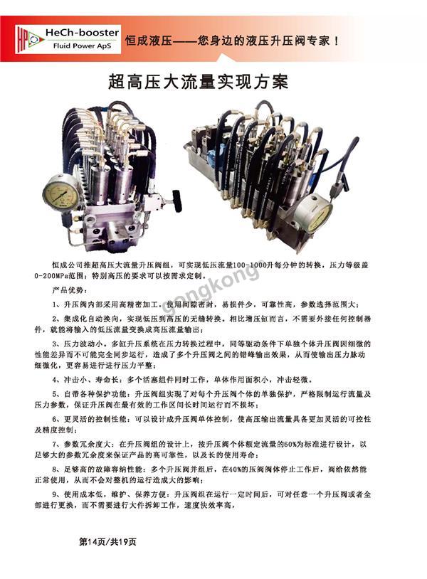 恒成液压专业从事超高压、价格合理、品质可靠,公司对增压器产品的研究项目发起于2008年,在充分吸纳及消化了进口产品技术的同时,对液压增压器、增压缸等产品进行了很多创新,使其延长使用寿命的同时,能适应于多种介质、多种压力等级,大幅度降低了进口液压增压类产品成本,使液压增压类产品能服务于