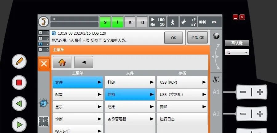 依次点击 菜单=>文件=>存档=>USB(控制柜)=>所有/应用/系统数据/Log数据/KrcDiag