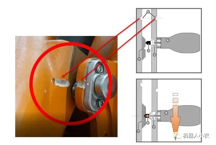 上面两个设备可以连接机器人的零点探针,机器人运动这个探针就会顶到检测凹槽。那么凹槽在哪呢?