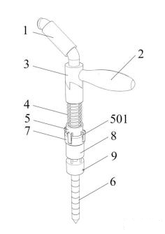 现在,我们通过这6个发明原理,得到了6个改进方案。接下来我们把上面的方案汇总成一个方案,就是下面的样子:在原有基础上,改进了第一手柄1的形状和方向;改进了第二手柄2的形状;在弹簧座5上设置了用于固定配重7的卡扣501;在钻头6根部设置了气缸8;钻杆6根部通过销孔与气缸活动部可拆卸连接;钻杆6为多节设置。