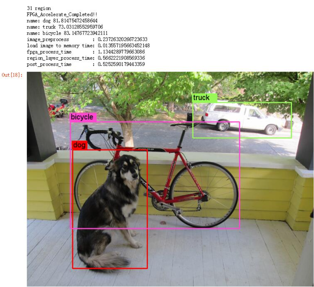 Tiny YOLO 模型在 ZU3EG 上显示检测结果的实时输出,视频帧中标注了检测到的对象