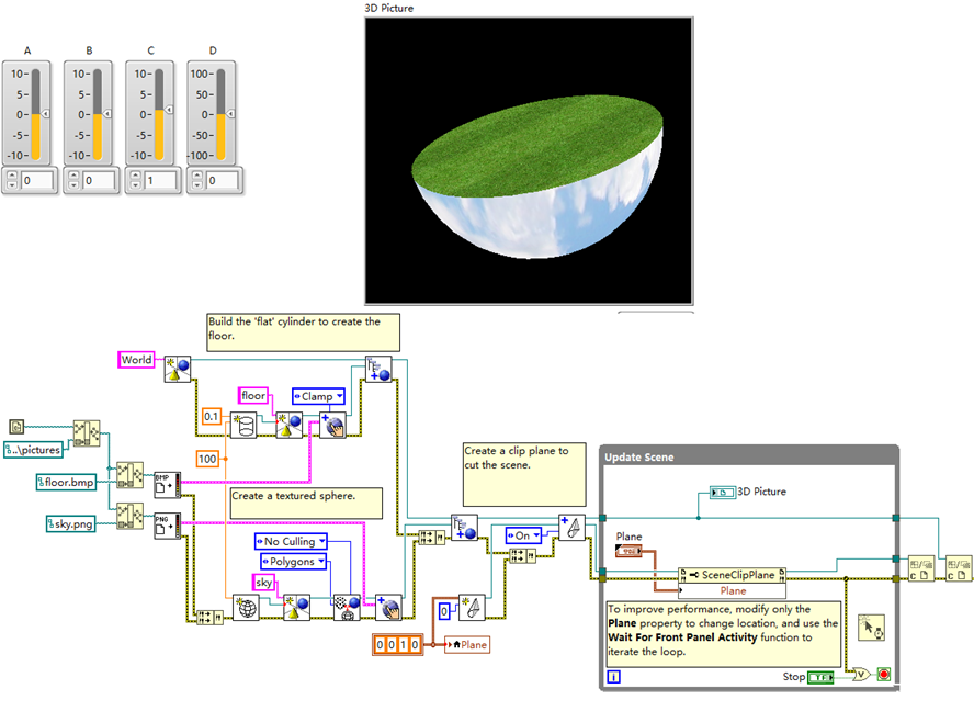 LabVIEW 作为图形化编程环境,在测试、测量与控制领域广泛应用,其 3D 功能可满足简单 3D 可视化需求。此示例结合裁剪平面与纹理映射,是 LabVIEW 3D 应用的基础场景,为后续开发更复杂 3D 交互程序(如虚拟仪器面板 3D 展示、简单虚拟仿真等)提供了基础参考。