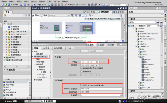 本案例是通过使用稳联技术研发的EtherCAT转Profinet网关将串行传输系统模块接入到西门子PLC的Profinet网络之中,具体配置如下