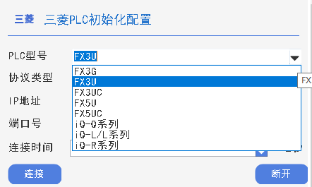 用户可利用平台资源管理器内的三菱初始化算子,根据实际需求选择合适的协议对三菱 PLC 进行初始化操作。该算子会依据用户选择的协议类型、三菱PLC型号(支持三菱FX3G、FX3U、FX3UC、FX5U、iQ-Q系列、iQ-L/L系列和iQ-R系列PLC使用)以及协议参数完成初始化工作,并输出三菱 PLC 对象。