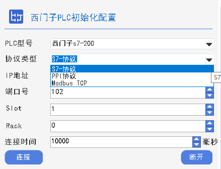 在平台资源管理器内,用户可通过西门子初始化算子对西门子 PLC 进行配置。该算子会依据用户选择的协议类型、西门子PLC型号(支持西门子s7-200、S7-200Smart、s7-300、s7400、s7-1200、s7-1500型号PLC使用)以及协议参数完成初始化工作,并输出标准化的西门子 PLC 对象。