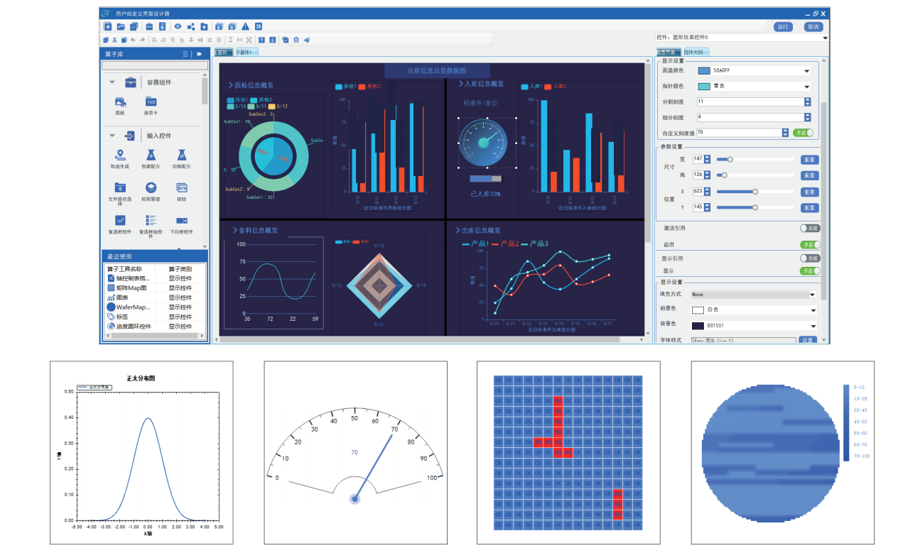 人机交互设计器提供了数百个简单易用的精美控件,包括按钮、标签、文本框、选择框、图片框、文件对话框、仪器仪表、 报表、图表、表格、运动控制控件、机器视觉控件等,可满足数据采集、运动控制、机器视觉、数据分析、数据仿真等各种工业场景的软件开发要求。