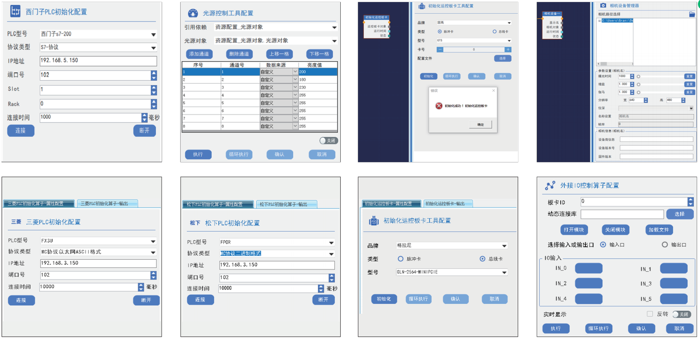平台统一了多种工控协议,包括OPC、MOTT、MC、S7、ModBus、串口、Socket、Can等20多种协议,支持西门子、 三菱、汇川等数十个品牌PLC;支持多家运动控制板卡,如格拉尼、固高、正运动、乐创、凌华等;支持各种主流相机、光源。