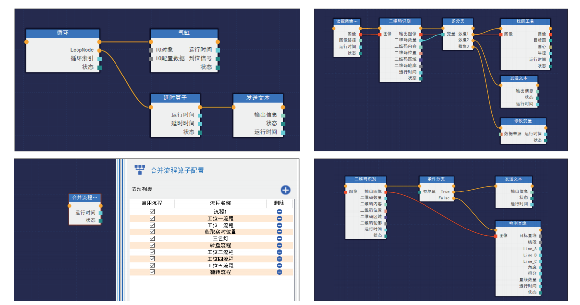 条件分支、多分支、循环工具、并行流程工具、延时工具等逻辑算子,支持多层嵌套,可实现复杂逻辑流程控制,能够满足 广泛的检测项目和运动控制等工控要求。思维导图式的图形化编程界面,让流程理解更直观