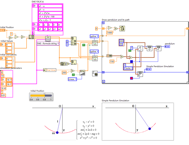 LabVIEW利用 DAE Radau 5th Order VI,通过微分代数方程(DAE)对单摆运动进行模拟,可改变初始位置观察单摆摆动情况,理解 DAE 在动力学模拟的应用。