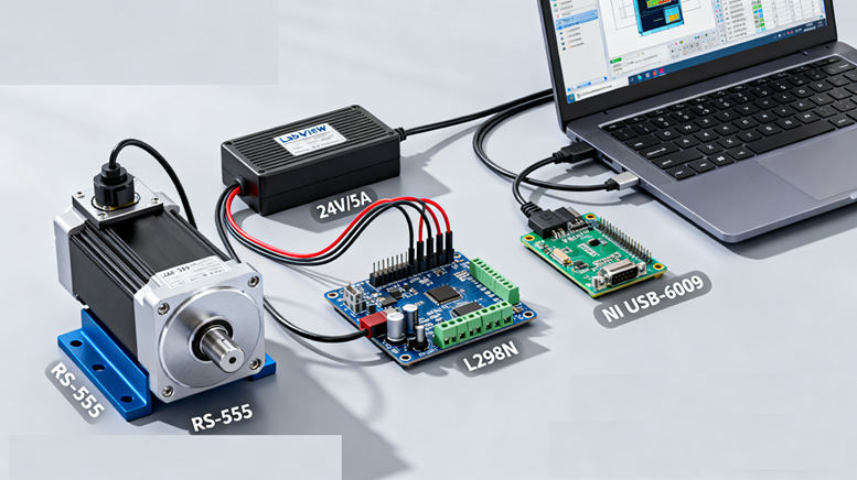 核心硬件选型:直流电机选用 RS-555 型(带增量式编码器,分辨率 1000 线);驱动模块采用 L298N 双 H 桥驱动器,支持 PWM 调速;数据采集卡选用 NI USB-6009(8 路模拟输入、2 路模拟输出、12 位分辨率);供电模块为 24V/5A 开关电源,给电机和驱动器供电,5V 辅助电源给编码器供电。