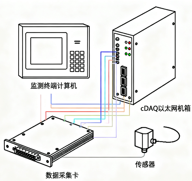 系统硬件以 NI 采集设备为核心,包括监测终端计算机、cDAQ 以太网机箱、3 块 NI-9208 数据采集卡(16 通道、24 位,采样率 500S/s)和 1 块 NI-9203 高速采集卡(8 通道、16 位,采样率 200kS/s)。传感器统一采用 4-20mA 电流输出型,经调理电路处理后完成 A/D 转换,通过以太网实现数据传输,显著提升抗干扰能力。