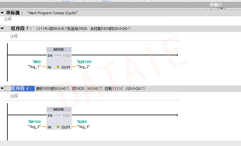 2台PLC分别通过以太网线连接达泰DTD418MB无线通讯终端,将天线接好以后,给DTD418MB和PLC供电,我们可以给1号PLC的I点输入信号,我们会发现对应的2号PLC的Q点就有输出信号。同样的操作我们可以给2号PLC的I点输入信号,我们会发现对应的1号PLC的Q点就有输出信号。2台PLC之间是通过达泰DTD418MB无线传输完成数据交互。