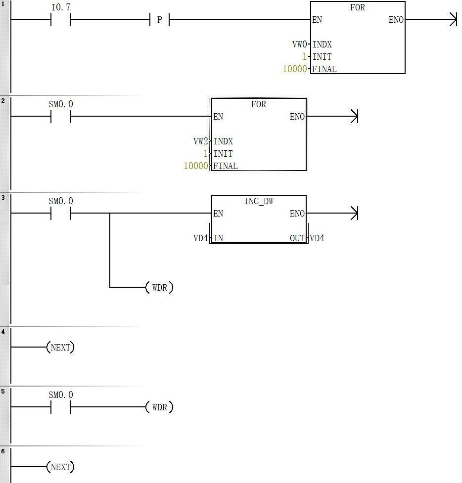 如下示例程序使用了嵌套的 FOR 循环结构。若循环完全执行完毕,VD4 中的值应达到 100000000。尽管程序中使用了 WDR 指令以延长扫描时间,但由于整个扫描周期仍超过 5 秒,递增指令未能执行全部次数。因此,每当 I0.7 接通一次,CPU 便会因扫描时间过长而进入 STOP 状态。