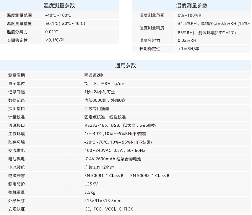 温度测量精度达±0.1℃(-20℃~40℃区间),湿度精度±1.5%RH(高精度型±0.5%RH,15%~85%RH/23℃±2℃环境),温度长期稳定性<0.1℃/年、湿度<1%RH/年,可作为实验室温湿度校准的基准参考标准,确保数据精准度与长期一致性。