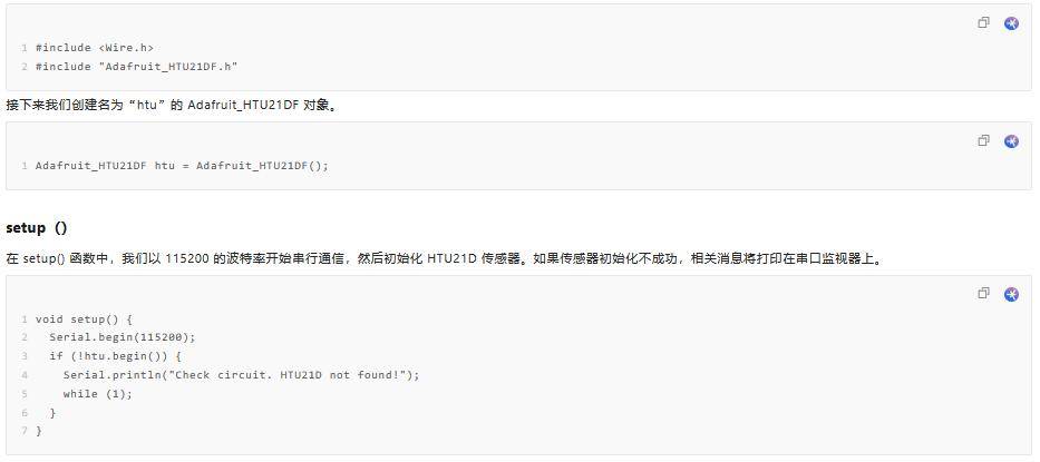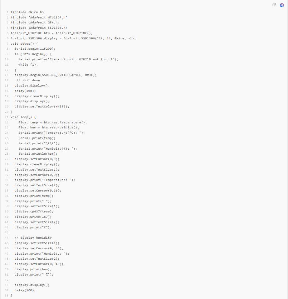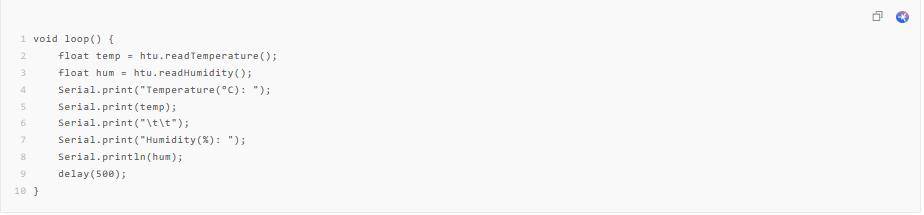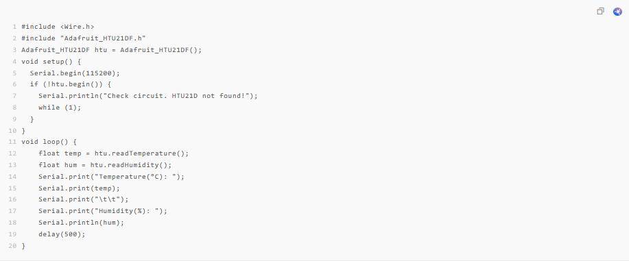 代码首先包含代码正常运行所需的所有必要库。Wire.h 将允许我们通过 I2C 协议进行通信。Adafruit_HTU21DF.h 库将使我们能够初始化和读取 HTU21D 传感器。