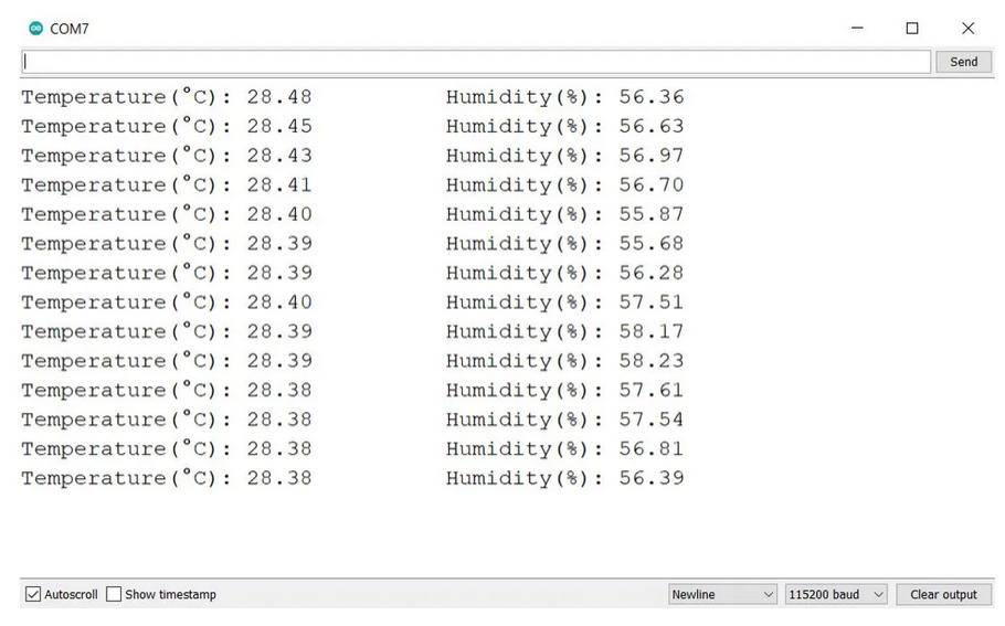 在您的 Arduino IDE 中,打开串行监视器并将波特率设置为 115200。串行监视器将开始显示温度和湿度读数以及单位。每半秒后将显示新读数。