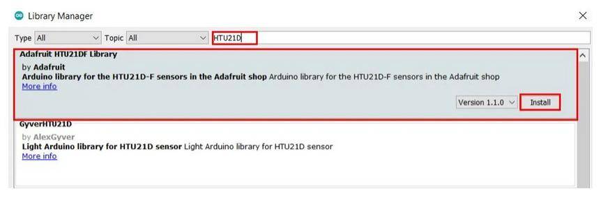 我们将使用 Arduino IDE 中的库管理器来安装最新版本的库。打开您的 Arduino IDE 并转到 Sketch > Include Libraries > Manage Libraries。 在搜索栏中输入 HTU21D 并安装最新版本。