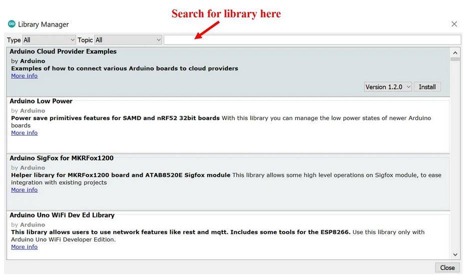 打开 Arduino IDE 并单击 Sketch > Library > Manage Libraries。将打开以下窗口。