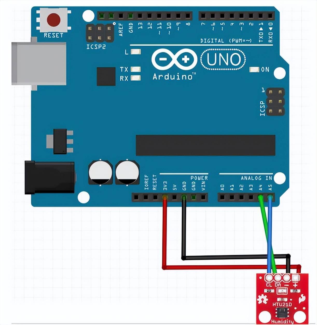 HTU21D 与 Arduino 板的连接非常简单。HTU21D模块的VCC端接Arduino的3.3V,地接地(common ground),传感器的SCL接Arduino的SCL脚(A5),传感器的SDA接Arduino的SDA脚(A4) .