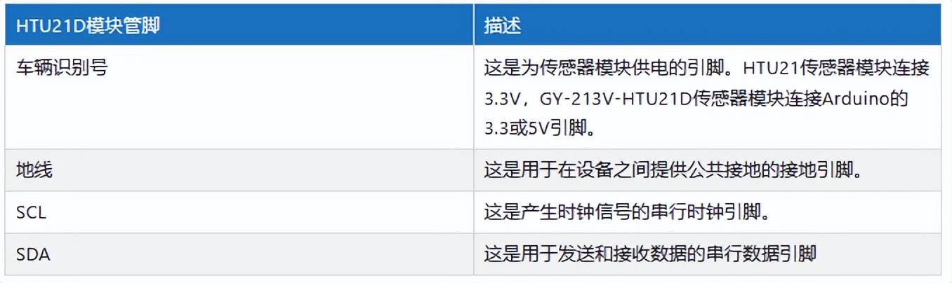 下面列出了 HTU21D 传感器模块的引脚排列及其简要说明。
