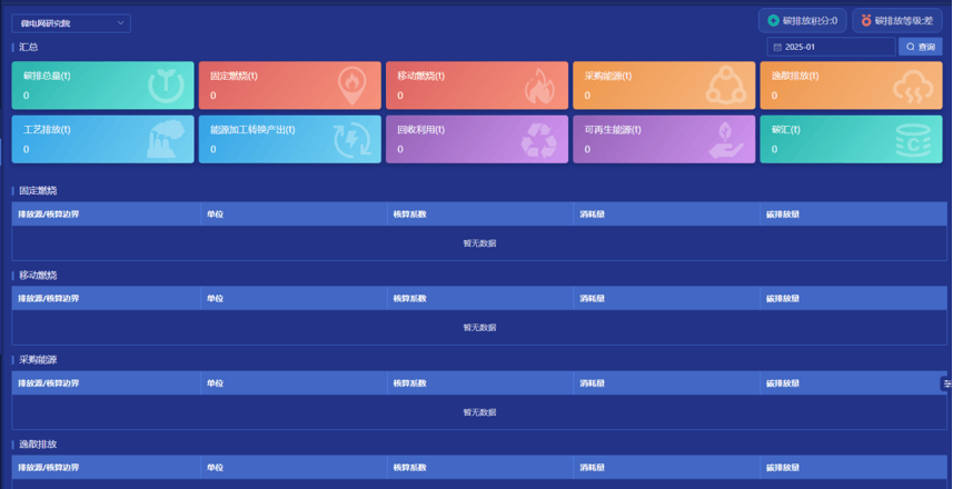 企业、部门、区域碳排监控;碳排统计、同环比分析;支持月、年碳排报表;碳盘查报告