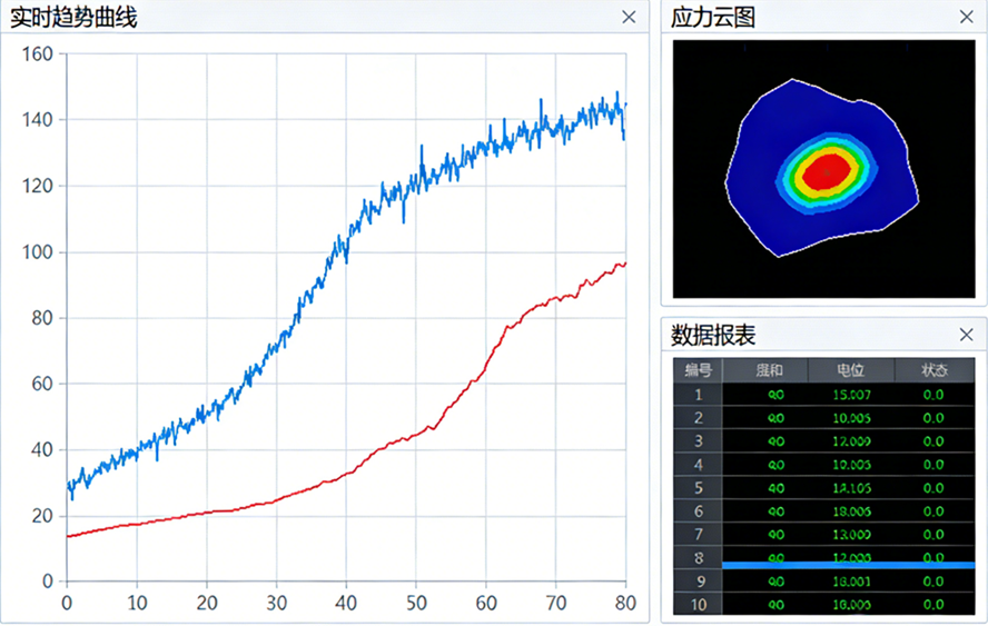 数据实时处理与多维度显示:利用 LabVIEW 丰富的信号处理函数库,对采集的应变原始数据进行滤波、降噪、标定等实时处理,通过内置的数学运算模块快速计算应变值、应力分布等关键参数,运算延迟低于 50ms。 支持自定义多界面显示功能,可同时呈现实时数据报表、应变趋势曲线、应力云图等多种形式,界面布局可通过 LabVIEW 的前面板编辑功能灵活调整,工程师可直观掌握不同测点的应变波动情况;通过控件关联设置,实现数据与图表的联动交互,点击曲线即可查看对应时间点的详细数据。