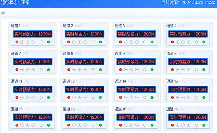 阈值报警与故障预警:通过 LabVIEW 的逻辑判断模块,预设螺栓预紧力安全阈值范围,当某通道数据超出阈值(如出现异常峰值、零值或标准差突变)时,系统自动触发灯光报警功能(界面对应通道指示灯变红闪烁),同时弹出报警日志,记录异常发生时间、通道编号及具体数值。报警逻辑可通过 LabVIEW 的条件结构灵活调整,支持多级阈值设置(预警值、故障值),满足不同故障等级的响应需求。